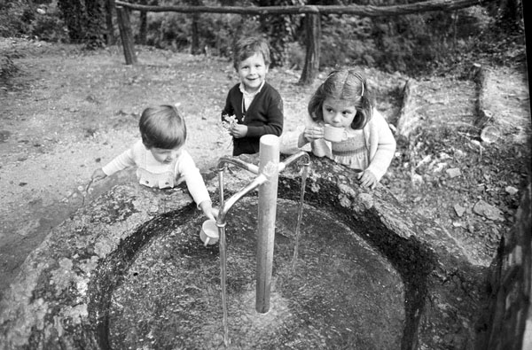 (Ampliar) - Mainada jugant a la font del Ferro. 1980. Joan Comalat Vila. INSPAI - Diputació de Girona.