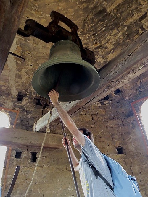 (Ampliar) - Blai Ciurana i la campana Ramona durant el repic de Festa Major.