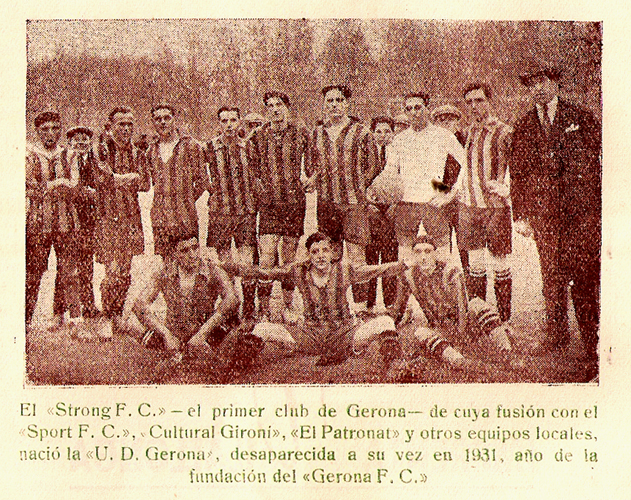 Un año más tarde, a mediados de 1909, surgía en forma de entidad la primera agrupación de aficionados al fútbol. Se denominaba "Strong F.C." y en realidad ha sido la piedra básica del fútbol gerundense. De esta entidad salió luego la gloriosa "U.D.G." (Unión Deportiva Gerona), que más tarde dió paso al actual "Gerona C. F.".