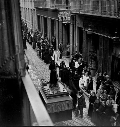 (Ampliar) - Celebració del Divendres Sant. Vista de la processó al seu pas pel carrer Nou des del balcó de la casa Batlle. Al fons, la farmàcia i la drogueria El Globo. 1922. Autor: Carles Batlle Ensesa. Col·lecció Ajuntament de Girona.