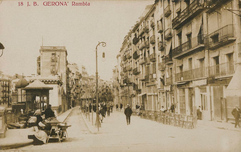 (Ampliar) - Rambla De la Llibertat. A la dreta, la farmàcia Riera. 1910-1919. Autor desconegut. Col·lecció Josep Bronsoms Nadal. Ajuntament de Girona.