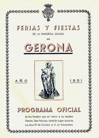 Fires de Sant Narcís de l'any 1951LA FIESTA DE TODOS Tú lector que abres este programa, por ligeramente que pases los ojos por sus páginas, comprobarás enseguida que las Ferias y Fiestas de Gerona tienen un mérito que no todas las fiestas mayores poseen. Más de una vez hemos oido decir, al hablar de la fiesta de tal villa o pueblo: "A mi esta fiesta y otras similares no me interesan, porque no gustñandome los bailes ya no se que hacer". Realmente en punto a fiestas mayores, de muchas de ellas podemos decir que son fiestas en sentido único. No ocurre así con nuestras Ferias y Fiestas, puesto que aquí todas las edades de la vida y todos los estamentos sociales hallan con qué divertirse, pasar un rato, y aun mas cultivar y expansionar nobles sentimientos. Aqui el niño, el adolescente, el joven y el anciano tienen una infinidad de ocasiones para experimentar que esas jornadas son para él jornadas extraordinarias, en el curso de las cuales verá y degustará cosas que no están a su alcance todos los días. ![]() El hombre religioso hallará ancho campo para su piedad en las solemnidades que se desarrollan en honor del insigne Patrón San Narciso. El hombre de negocios verá la ciudad transformada en una verdadera Lonja en la que la Feria despierta auténtico interés en múltiples aspectos. Al hombre de letras, al artista no le faltarán ocasiones para satisfacer sus aficiones y de ponerse en contacto con significados elementos de la cultura y del arte. El deportista verá abrirsele como un abanico un programa de actos en el que lo difícil es escoger ante la imposibilidad de seguirlo todo. El amigo de la vida de sociedad tampoco habrá de quedar defraudado: Gerona por tradición, durante sus Ferias, es un prestigioso punto de cita de la sociedad elegante de todas sus comarcas. Y el pueblo, el hombre de la calle... éste puede gloriarse de que tiene toda la ciudad por suya desde la mañana hasta la noche, para dar pábulo a su curiosidad con sólo abrir los ojos y "encantarse" ante la policromía, la polifonía, el vaivén y el barullo que se han adueñado de las calles en un frenesí que a ciertas horas hace rodar la cabeza sin necesidad de subir al tiovivo. Para todos es la fiesta y a todos, nativos y forasteros, va dedicado este Programa. C.B.V.
