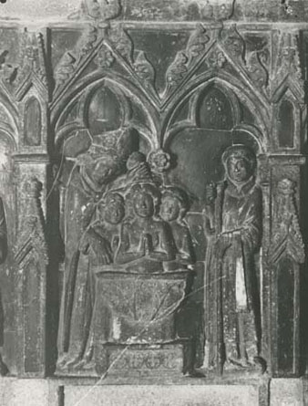 En 1328 realizose solemnemente el traslado del cuerpo del Santo de aquel antiguo sepulcro a otro, que fué colocado detrás y encima de la mesa del altar de Sta. Afra, constituyendo una bella bra gótica, labrada en mármol agisado y costeada por el chantre D. Gerardo de Socarrats. En este sepulcro aparecen esculturadas algunas escenas en relación a la vida del Santo, representándose en la parte central San Narciso oficiando de cara al pueblo.