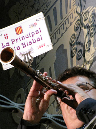 Músic de la Principal de la Bisbal en un dels balcons de la plaça del Vi, durant les interpretacions musicals.
