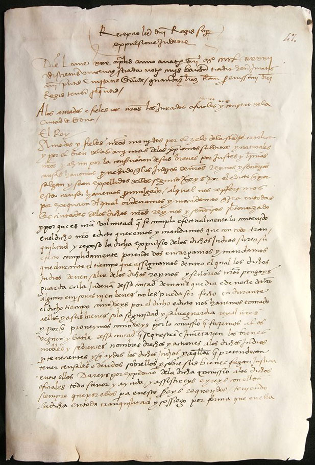 (Ampliar) - Document d'expulsió, anvers. Manual d'Acords, 20 abril de 1492. El dia 20 d'abril de 1492 els Jurats de Girona varen rebre notificació de l'ordre del rei que manava que abans del dia 31 de juliol tots els jueus i les jueves que no es volguessin convertir marxessin de la ciutat per a no tornar-hi mai més. Arxiu Municipal de Girona.