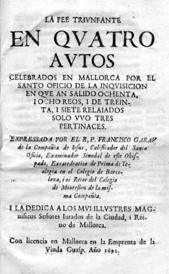 La Fee triunfante en quatro autos celebrados en Mallorca por el Santo Oficio de la Inquisicion en que an salido ochenta i ocho reos, i de treinta i siete relajados solo uvo tres pertinaces, expressada por el R.P. Francisco Garau. Mallorca: en la Emprenta de la Viuda Guasp, 1691. Biblioteca de montserrat