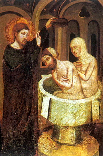 Bateig de jueus. Detall del retaule de Sant Marc, Arnau Bassa 1346. Col·legiata Basílica de Santa Maria de Manresa.