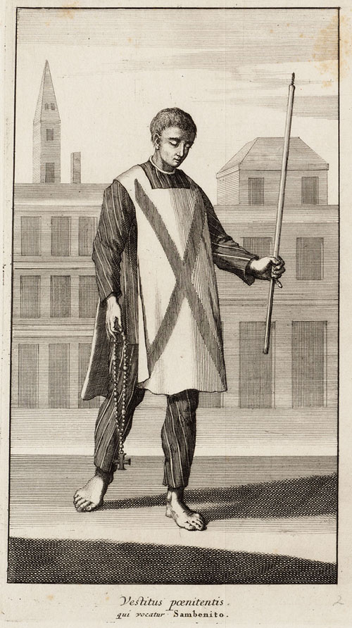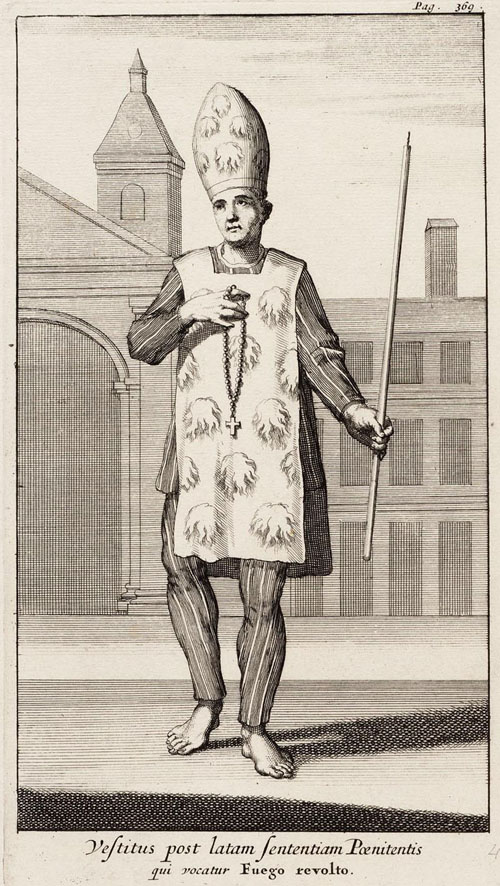 (Ampliar) - La gramalleta dels penitents. Gravat de "Historia Inquisitionis" de Philipp van Limborch, Amsterdam 1692. Biblioteca de Catalunya