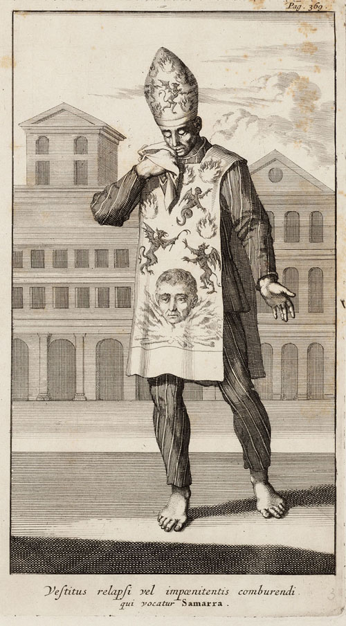 (Ampliar) - Samarra. La samarra amb dibuixos de flames i rostres diabòlics indica que el condemnat no s'ha penedit i serà cremat viu. Gravat de "Historia Inquisitionis" de Philipp van Limborch, Amsterdam 1692. Biblioteca de Catalunya