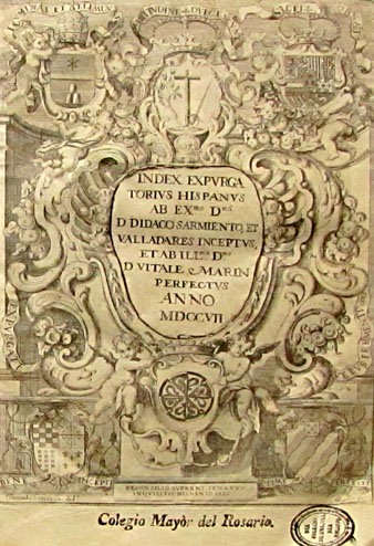 Índex de llibres prohibits per la Inquisició. "Índice expurgatorio español, del Rey Católico Felipe V, comenzado por el Excmo. Sr. D. Diego Sarmiento y Valladares...", 1707