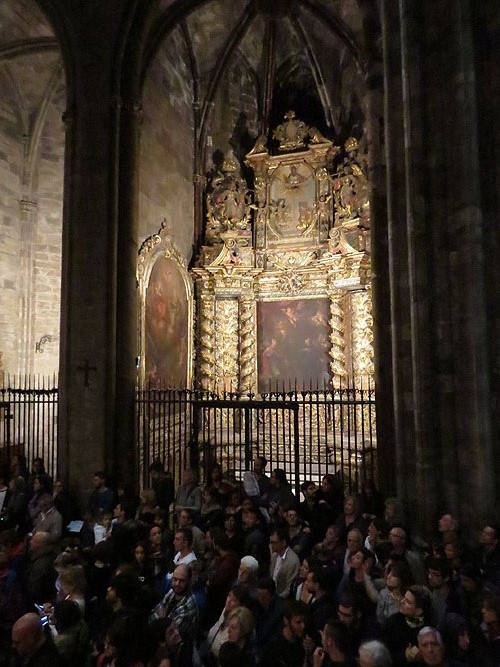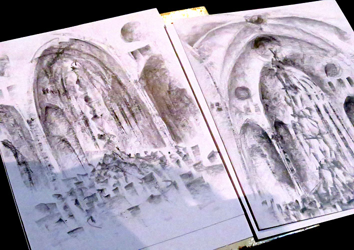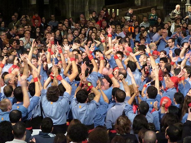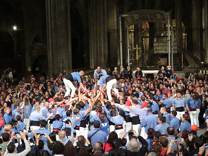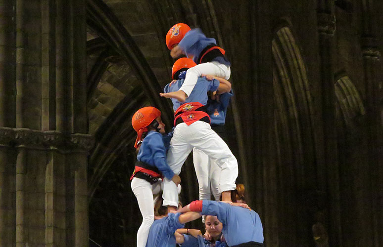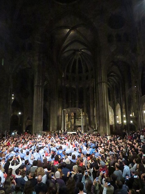 (Ampliar) - Apunts dels castells dins la nau de la Catedral, fets per Joan Escribà Serra. Imatge presa per gentilesa de l'autorA la finalització de la pujada del pilar, a les portes de la Catedral, varen donar la benvinguda als Marrecs l'alcaldessa de la ciutat, Marta Madrenas, i el bisbe de Girona, Francesc Pardo. Els pilar, al capdamunt de les escales, es va girar per saludar el nombrós públic que es va concentrar a la plaça i a l'escalinata de la Catedral per contemplar l'actuació dels castellers.