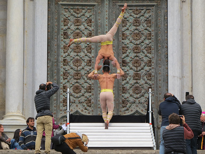 ![]() (Ampliar) - Pablo Nonato i Joel Yaicate, el duo Vitalys, al capdamunt de les escales de la Catedral. ![]()