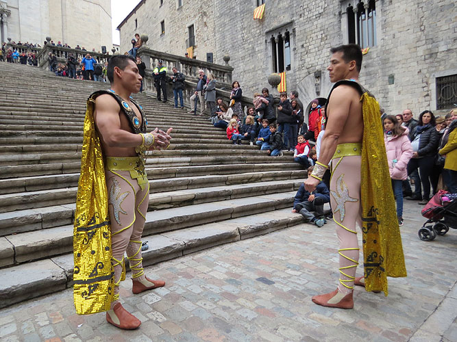 El dilluns 29 d'octubre 2018, diada de Sant Narcís, els peruans Duo Vitalys (Pablo Nonato i Joel Yaicate) van batre el rècord Guinness de pujar esglaons cap en cap, una modalitat en equilibri en què el portor sosté amb el cap el seu company en posició invertida mentre puja escales. Van pujar 99 esglaons en 53 segons, superant la marca de fa dos anys d'una parella vietnamita, els Giang Brothers, que va pujar els 90 de l'escala de la Catedral. ![]() (Ampliar) - Moment de l'arribada a l'últim graó. L'organització del repte anava a càrrec del Circ Charlie Rivel, que tenia en aquest acte, en una prèvia a les diferents actuacions previstes a la Cúpula de les Arts. Per poder certificar el rècord, seguint la normativa, calia disposar de cronometradors oficials, que van anar a càrrec del GEiEG, un enginyer que mesurava la distància i gravacions en directe ininterrompudes des de diferents angles, entre d'altres. Tot es va enviar als responsables del Guinness. ![]() (Ampliar) - Joan Mompart amb el Duo Vitalys, dalt les escales de la Catedral. ![]() (Ampliar) - Preparació de la pujada les escales de la Catedral. |