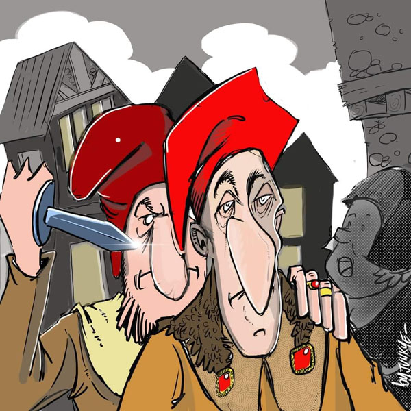 (Ampliar) - Dibuix de Jordi Juncosa byJunkye al·lusiu als enfrontaments entre les famílies Agullana i Sarriera. ![]() Escut de la família Agullana. ![]() Escut de la família Sarriera. |
