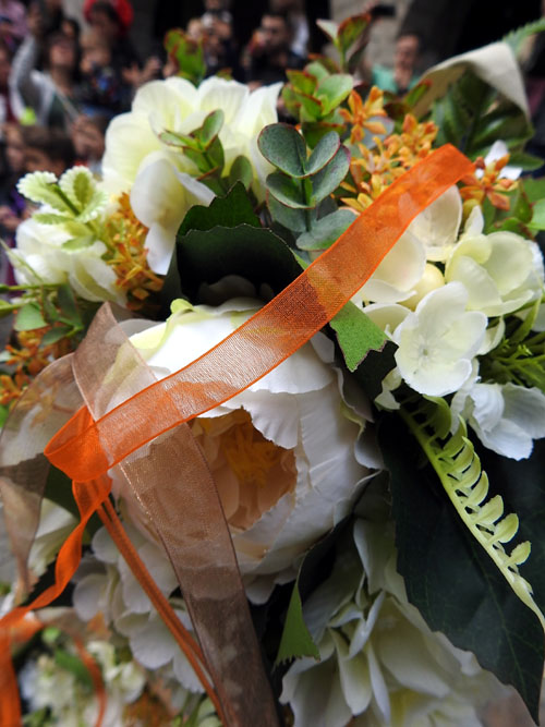 (Ampliar) - Ball de gegants i gegantes a la plaça del Vi Els rams els fa una florista de la colla Fal·lera Gironina i cada any conviden a una figura femenina per fer el canvi de ram. Enguany la homenatjada ha estat M. Àngels Vila, durant molts anys activa activa i participant en les cercaviles i activitats de la colla gegantera, i que aquest any deixa de portar el Fraret, el capgròs que feia ballar durant totes les Fires.