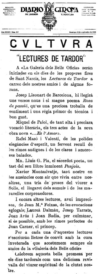 Notícia sobre les activitats de la Galeria dels Bells Oficis publicada al 'Diari de Girona d'avisos i notícies' el 19/9/1920.