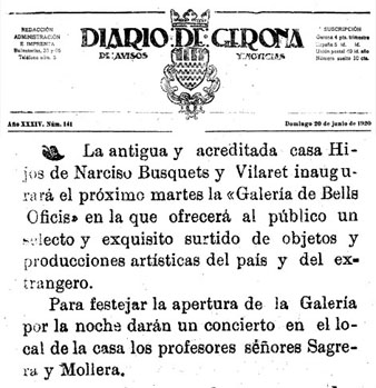 El Diario de Gerona anunciava que l'establiment dedicat a l'exposició i venda d'objectes d'art i decoració, era destinat a obrir “una nova etapa en la vida ciutadana” i a erigir-se en “llar i santuari de l'art més pur”. Fins aquell moment, i deixant de banda la bellíssima i fugaç excepció que va representar Athenea, els artistes havien d'exposar la seva obra, des del segle XIX, a espais més o menys improvisats com el claustre del Museu de Sant Pere de Galligants, els locals del Foment i l'Schola Orfeònica o, més correntment, enmig dels marcs i els joguets dels aparadors de les botigues de Francesc Estruch, Titus Corominas o Can Maresma. -