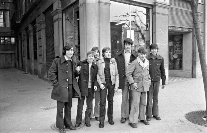 Festa de Sant Tomàs d'Aquino, patró dels estudiants. Retrat d'un grup d'estudiants a l'encreuament entre la Rambla de la Llibertat i el carrer dels Germans Busquets. 1974. Narcís Sans Prats. CRDI - Ajuntament de Girona - (Ampliar)