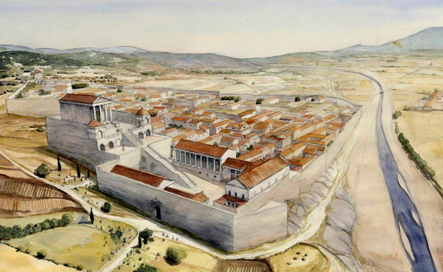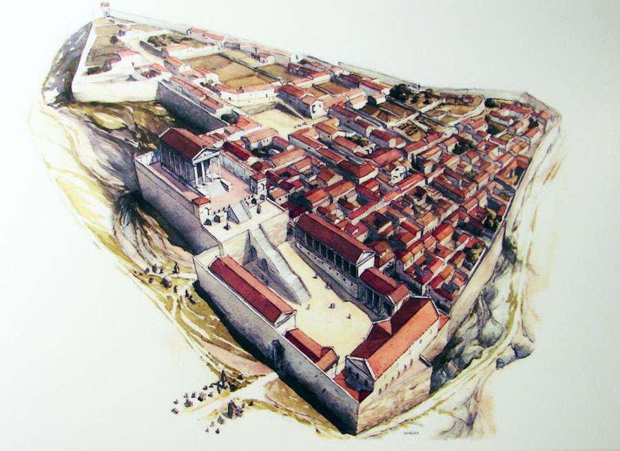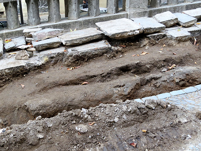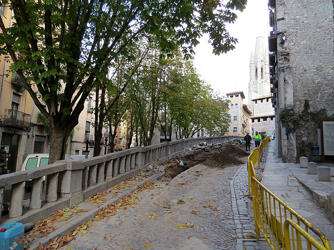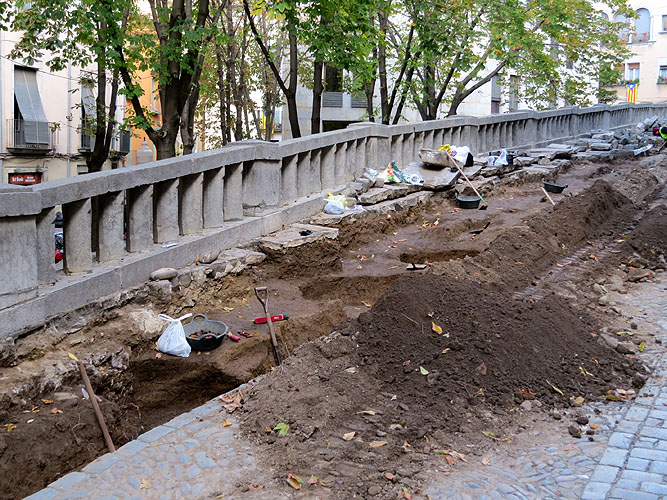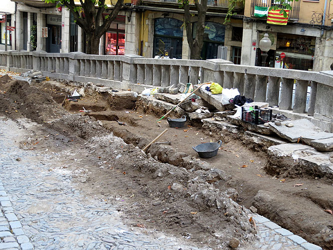 Arran de les obres de sanejament que durant el mes de novembre 2015 s'han practicat a la pujada de Sant Feliu, s´han posat al descobert diversos elements que formaven part de l'antiga estructura romana de Gerunda, datades entre el 50 aC i el 150 dC, que corresponen a l´etapa de formació de la ciutat com a entitat urbana. ![]() (Ampliar) - Recreació de Gerunda. Dibuix de J. Sagrera. A la banda dreta, a tocar l'Onyar, s'hi ha representat el pendent rocós a tocar del qual s'han localitzat la via i les sitges.