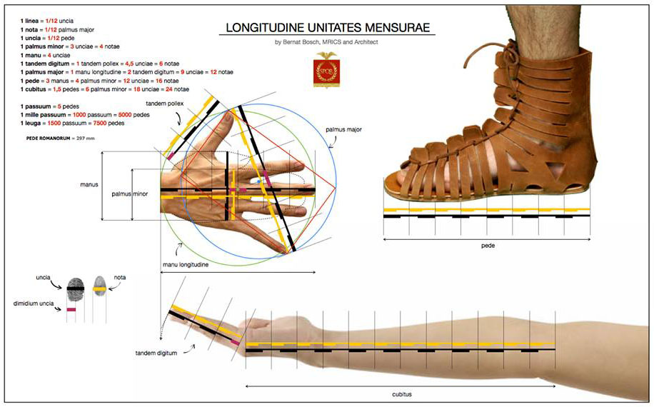 Les estructures descobertes permeten parlar d´una topografia desconeguda fins al moment; fins ara es pensava que la ciutat s'acabava, des del punt de vista urbanístic, a la banda oest de l'actual pujada de Sant Feliu, indret en el qual hi hauria el pendent rocós que marcava el terme de l'estructura urbana fundada pels romans al segle I aC. ![]() (Ampliar) - Mesures romanes de longitud. Estudi de l'arquitecte Bernat Bosch, gentilesa de l'autor.