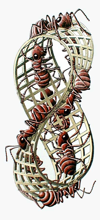 La Banda o Cinta de Moebius, un dels objectes matemàtics més famosos dins i fora de la pròpia matemàtica, és una superfície d'una sola cara i un sol contorn, que té la propietat matemàtica de ser reglada, i és topològicament no orientable. Va ser descoberta de manera independent pels matemàtics alemanys August Ferdinand Moebius i Johann Benedict Listing l'any 1858. |