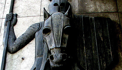 Situat a la façana de l'edifici nº 31 de l'Avinguda de Jaume I, coneguda també com Gran Via, a la cantonada amb el carrer de la Sèquia, és obra de l'escultor Francesc Torres Monsó.