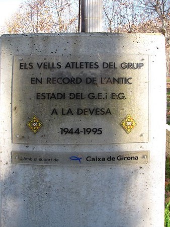 conjunt d'arbres que volen ser el conjunt del Mediterrani i una columna hel·lena, lloc on va iniciar-se aquest esport. La inscripció que es pot llegir diu "Els vells atletes del Grup en record de l'Estadi del GEiEG de la Devesa,