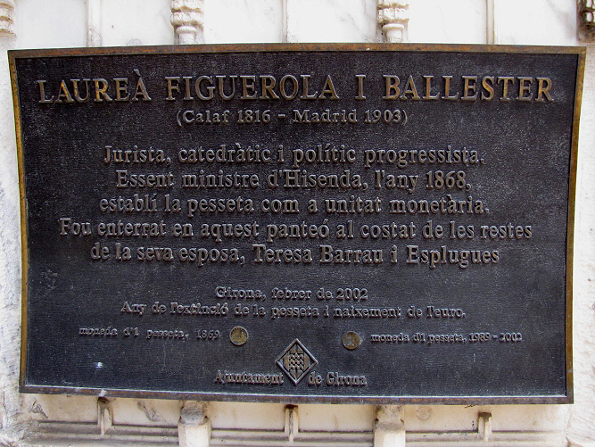 L'economista i polític català Laureà Figuerola, nascut a Calaf el 4 de juliol de 1816, i mort a Madrid el 28 de febrer de 1903, és conegut per la creació de la unitat monetària de la pesseta (1). Les seves despulles, per voluntat de la seva esposa, reposen a Girona, a on va ser traslladat des de l'hotel del carrer Serrano on va morir.