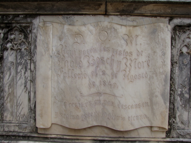 (Ampliar) - Làpida frontal del panteó. El text diu: "D.O.M. Aquí yacen los restos de Pablo Bosch y Moré. Falleció el 2 de agosto de 1849. Sus cenizas en paz descansen y su alma goce de la gloria eterna".