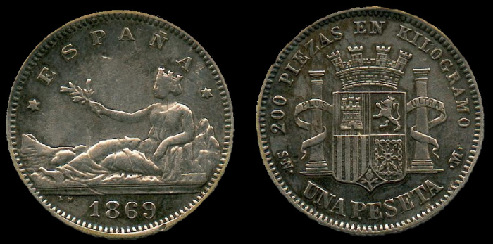 (Ampliar) - Anvers i revers d'una pesseta de 1869 (Viquipèpedia)