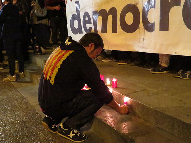 (Ampliar) - Ofrena d'espelmes davant l'edifici de Correus. Tot seguit, la manifestació va continuar per la Gran Via de Jaume I, amb les espelmes que portaven els manifestants enceses, i va finalitzar a plaça de la Independència. Abans de finalitzar, es va fer una parada a l'edifici de Correus i Telègrafs, on es va estendre una pancarta amb la paraula "Democràcia", i on diverses persones varen oferir les seves espelmes.