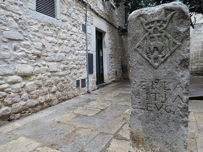 (Ampliar) - Fita 'Per la mitja llevga', situada actualment a la placeta de l'Institut Vell, al carrer de la Força. Els límits històrics de Girona.
