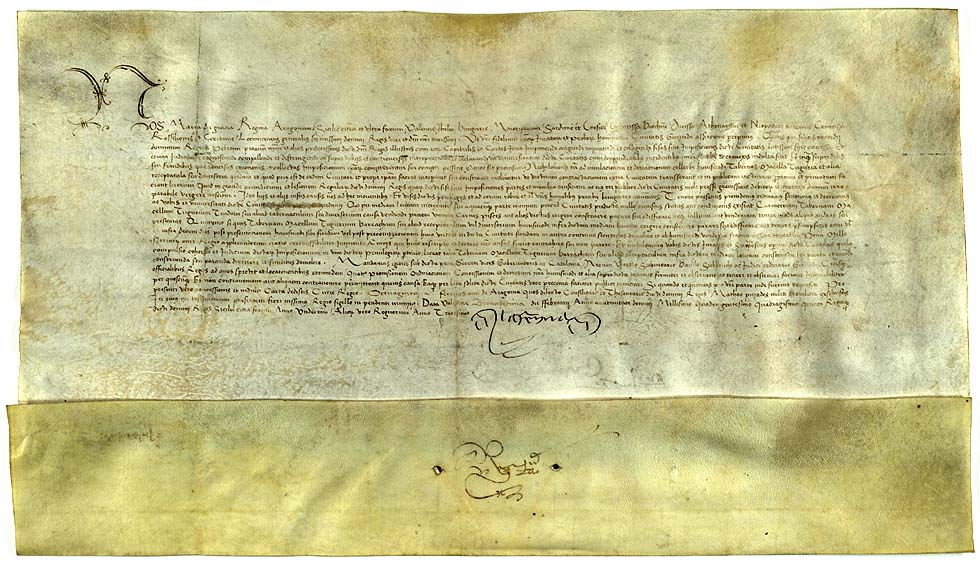 (Ampliar) - Privilegi atorgat per la reina Maria de Castella a la ciutat de Girona. 10 de febrer de 1445. Fons Ajuntament de Girona. Les fites.