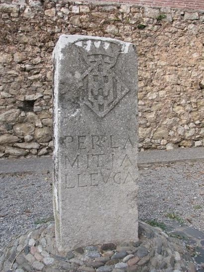 L'objectiu d'aquesta imposició era evitar la pèrdua d'ingressos que tenia una Girona que ja havia viscut els seus moments més esplendorosos. Molts comerciants, carnissers i taberners, amb l'objectiu d'evitar els impostos que es cobraven a l'entrada de la ciutat van decidir instal·lar els seus negocis a l'exterior de la muralla, prop dels camins o als ravals. Als transgressors del privilegi reial se'ls amenaçava amb la demolició de l'establiment o una multa de 1.000 florins d'or. - Fita 'Per la mitja llevga', situada actualment a la placeta de l'Institut Vell, al carrer de la Força. Model 3D elaborat per Xavier Busquets.