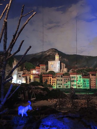 (Ampliar) - Vista general del diorama del Pessebre de les comarques gironines a la Fontana d'Or.Entre altres indrets representatius de la diversitat paisatgística i monumental de les comarques gironines, s'hi poden comtemplar el pont medieval de Besalú, les voltes de Calella de Palafrugell, les cases de l'Onyar de Girona, els embarcadors de l'estany de Banyoles, el santuari dels Àngels, el cingle de Castellfollit de la Roca, etc.