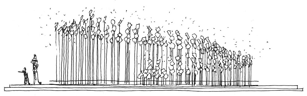 Aquesta idea es materialitza amb un garbuix de 100 cables d'acer trenat i tensat, que per un costat tenen origen a 10 abraçadores