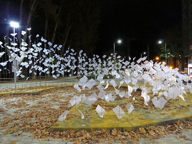 Una nebulosa de reflexes i llum que es materialitza mitjançant un entramat de papers blancs translúcids que vola i s’eleva gràcies a un conjunt de varetes de diferents alçades ancorades a planxes trapezoïdals de ferro col·locades radialment. Aquesta disposició radial del conjunt dintre de la rotonda dóna dinamisme a la intervenció i genera un punt de sorpresa tant per l’espectador del cotxe com per el vianant.