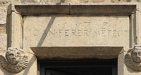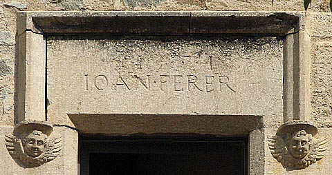 Les tres finestres amb angelets, i dues amb inscripcions, de la façana principal. |