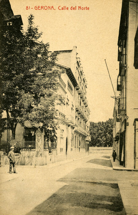 (Ampliar) - Vista del carrer del Nord amb la Gran Via de Jaume I al fons. A l'esquerra, fent cantonada amb el carrer Anselm Clavé, el xalet Juandó-Casa Furest. 1910. Autor desconegut. CRDI - Ajuntament de Girona.
