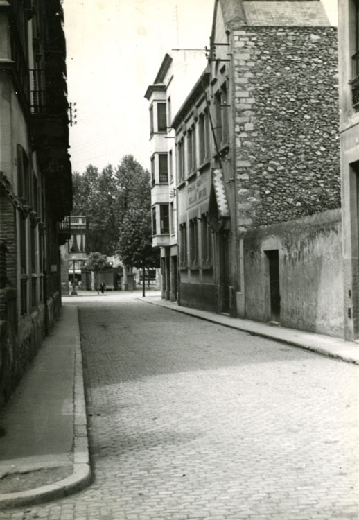 (Ampliar) - El carrer del Nord després de la col·locació de les llambordes. Vista amb la Gran Via Jaume I al fons. A la dreta, la desapareguda Escola de Dibuix. 1952. Francesc Coll. CRDI - Ajuntament de Girona.