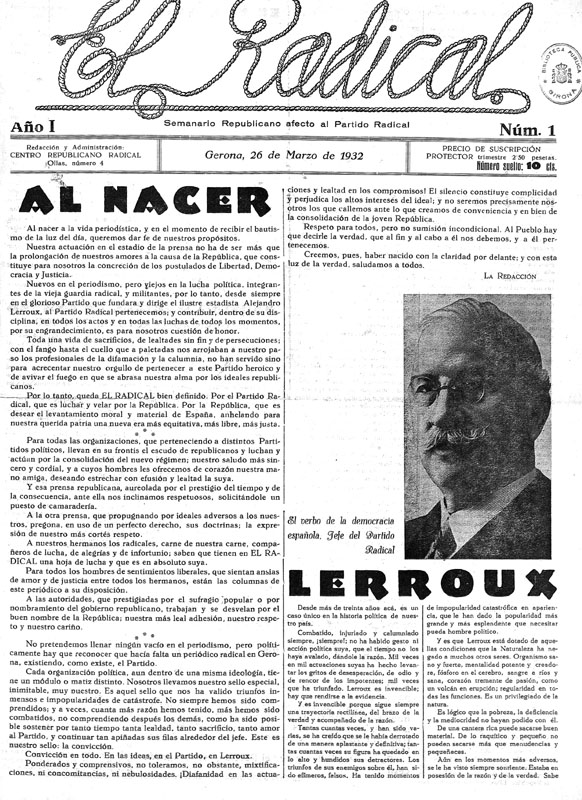 Primer número del setmanari 'El radical: semanario republicano afecto al Partido Radical' 26/03/1932. Biblioteca Virtual de Prensa Histórica. Ministerio de Cultura y Deporte. - (Ampliar)