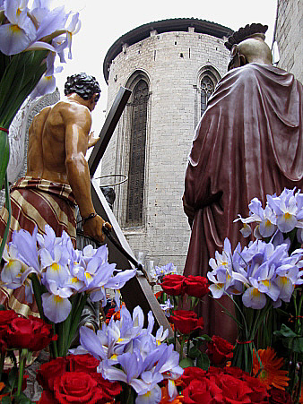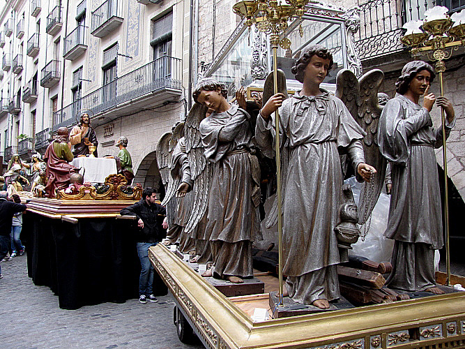 Els dos passos que no han estat exposats als Dolors, els de la Confraria de Jesús crucificat, Manaies de Girona, que representen la caiguda de Jesús i l'Ecce Homo, són trets del Castrum, l'església de Sant Lluc, fins davant d'aquesta, on també són preparats per l'esdeveniment. Els visitants avisats que acull la ciutat aquests dies de Setmana Santa fan cap a la plaça de la Catedral per contemplar, en un moment únic a l'any, aquesta activitat d'ornament i contemplar els passos de ben a prop, tant des de la mateixa esplanada amb la façana de la seu gironina de teló de fons, com també amb la perspectiva que dóna veure´ls des de l'escalinata de la catedral. 22 d'abril de 2011, divendres sant. |