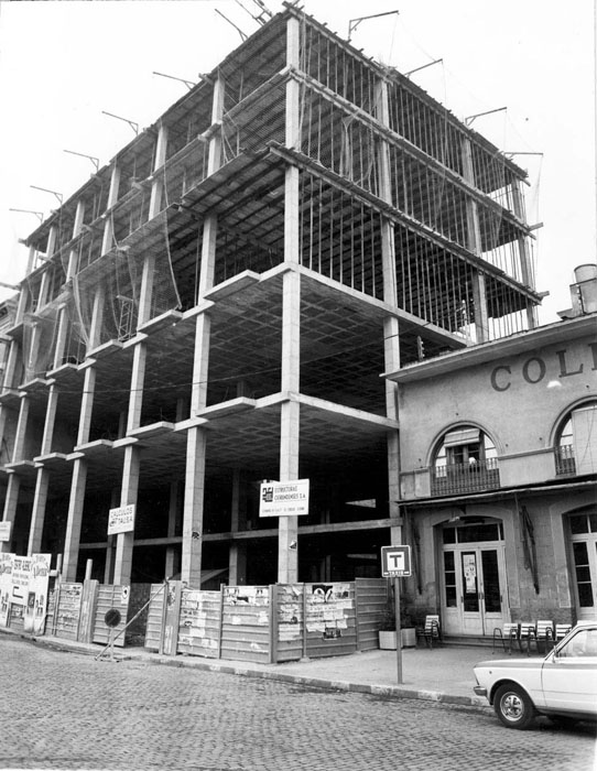 (Ampliar) - Construcció d'un bloc d'habitatges seguint el projecte inicial de la plaç, a l'espai comprès entre Correus i el cinema Coliseu. 1981. Autor desconegut. CRDI - Ajuntament de Girona.