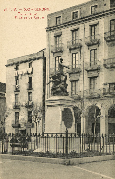 La plaça està presidida per un monument dedicat als defensors de Girona durant els setges de 1808-1809, inagurat durant les Fires de l'any 1894 amb l'assistència del capità general Valerià Weyler Nicolau i l'alcalde Francesc de Ciurana Hernández, i que havia estat subvencionat pel patrici Ferran Puig. El grup escultòric, titulat "Gerona 1809" va ser executat a Roma per Antoni Parera Saurina, i sembla que representa Álvarez de Castro, un voluntari amb un trabuc a la mà i el cadàver d'un soldat francès als seus peus.