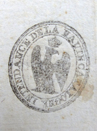 Segell de la "Intendance de la Haute Catalogne", revers de document postal datat a Girona el 21 de gener de 1813, durant la ocupació napoleònica de la ciutat. Col·lecció privada, Girona.