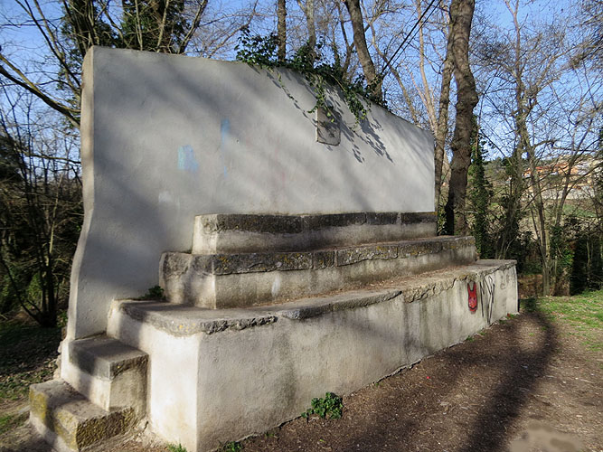 ![]() Situada a la Vall de Sant Daniel, la Plaça de les Sardanes és un espai herbat envoltat d'arbres, situat a la confluència de les rieres de Sant Miquel i de la Torre. S'hi accedeix travessant un passera de bigues metàl·liques, solera de formigó i baranes metàl·liques, a la que es puja per uns esglaons. A un costat de l'espai hi ha un cadafal per les sardanes, de tres esglaons de pedra de Girona, recolzats a un mur posterior on hi ha una placa escrita on es llegeix Plaza de la Constitución, en referència a la de 1869. En un dels seus extrems, i damunt la riera de Sant Miquel, es conserva un pou amb volta. ![]() (Ampliar) - El cadafal per a la cobla