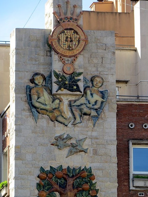 (Ampliar) - Decoració ceràmica a l'edifici 'La Caixa', obra dels arquitectes Bartomeu Llongueras i Juan Gordillo. Detall. [Més imatges]---