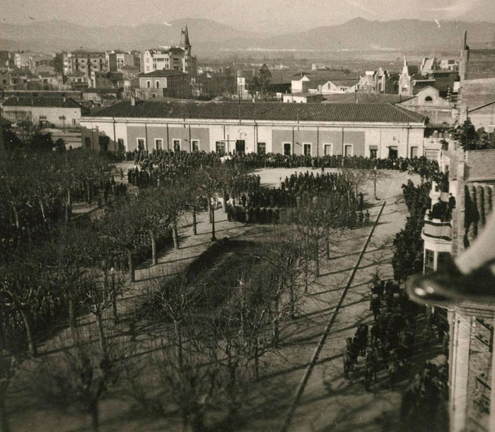 (Ampliar) - Vista des d'un punt elevat de la carretera Barcelona d'una desfilada militar a la plaça del Carril. Davant l'estació de tren, un altar i gent al voltant. Al fons al centre, l'edifici la Punxa i a la dreta, la farinera Teixidor. 1940-1945. Manel Nadal Oller (atrib.). CRDI - Ajuntament de Girona Qui era el Poeta Marquina? Nascut a Barcelona el 1879, Eduard Marquina i Angulo inicià la seva activitat literària com a col·laborador de les revistes "Pèl & Ploma" i "Joventut". El 1902 es traslladà a Madrid on començà a escriure obres de teatre de tema històric en un estil que recrea el teatre romàntic de Zorrilla, com "En Flandes se ha puesto el sol" o "Las hijas del Cid". També va escriure lletres per a sarsueles, mercès a la protecció de Chapí. El mateix 1902 aconseguí estrenar a Madrid un drama, "El Pastor", primera temptativa teatral, que no despertà cap mena d'interès, i al cap de poc estrenava una sarsuela amb música de Gay titulada "Agua mansa".