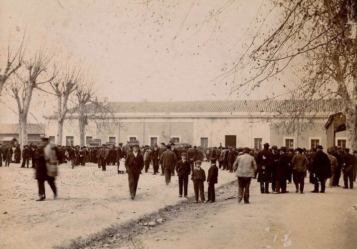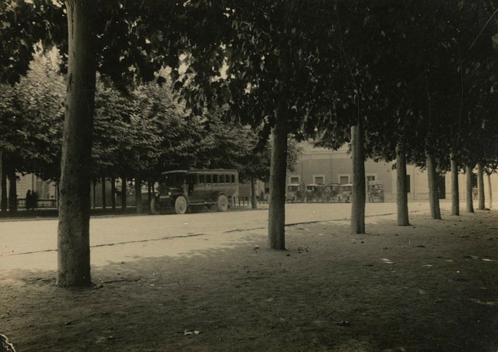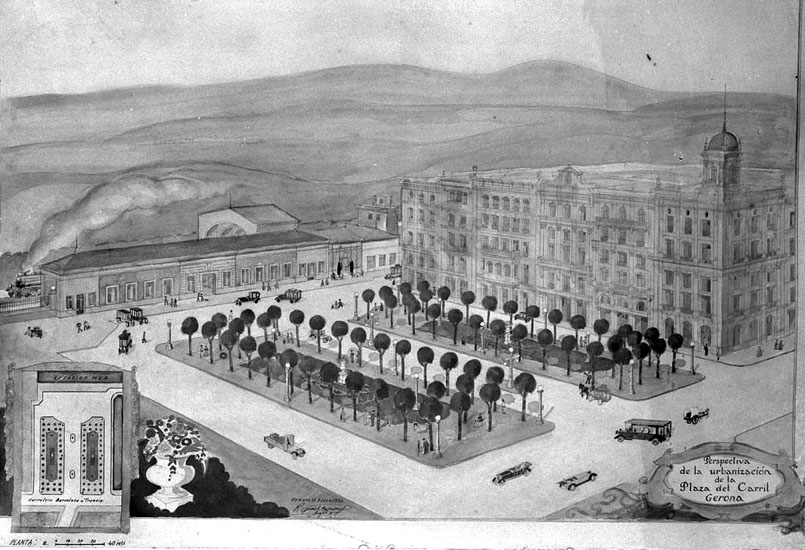 (Ampliar) - L'estació de tren de Girona, a la plaça del Carril. 1901. Amadeu Mauri Aulet. CRDI - Ajuntament de Girona. El refugi de la Guerra Civil. En aquesta plaça, aproximadament sota l'espai de jocs infantils, s'hi va construir, durant la Guerra Civil, un refugi. Durant els darrers dies del mes de gener i el dia 1 de febrer del 1939, al final de la guerra, es van produir els darrers bombardejos sobre la ciutat de Girona. Van morir més de 50 persones i centenars van resultar ferides. Entre les 10 i les 11 hores del matí del dissabte 4 de febrer van entrar les tropes feixistes, la IV División de Navarra i els legionaris, comandats per Camilo Alonso Vega. Van trobar una ciutat en flames, causades pels mateixos bombardejos i pels sabotatges de l’exèrcit republicà en retirada.