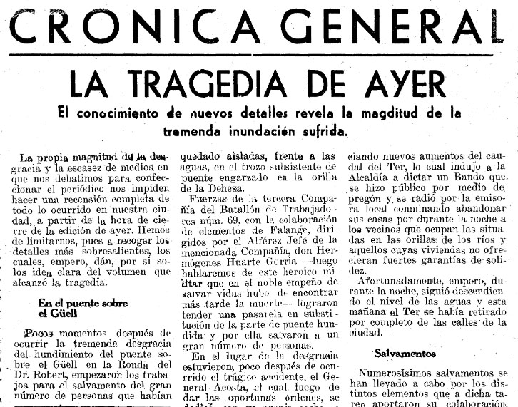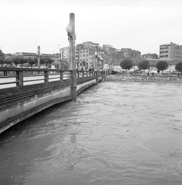 A poc a poc s'anaren coneixent detalls del terrible accident: "Pocos momentos después de ocurrir la tremenda desgracia del hundimiento del puente sobre el Güell en la Ronda del Dr. Robert, empezaron los trabajos para el salvamento del gran número de personas que habían quedado aisladas, frente a las aguas, en el trozo subsistente de puente engarzado en la orilla de la Dehesa". ![]() (Ampliar) - Inundació de 1962. El pont de l'alferes Huarte. Col·lecció Ajuntament de Girona.